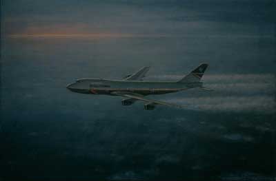 A British Airways "long-haul" 747-400 cruises along in the silence of the night sky six miles up.